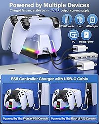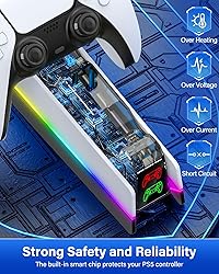 2.5Hrs FAST SPEED PS5 CHARGER FOR PS5 CONTROLLER: The upgraded ZRZLMVP ps5 controller charger is compatible with PlayStation 5 DualSense & DualSense Edge controllers. After the technical upgrade, the ps5 charging station is compact, takes up less space, and uses high-quality copper as the conductive contact point. So the playstation 5 controller charger can safely, securely, and quickly charge dual PS5 wireless controllers in just 2.5 hours simultaneously 9 COLORFUL LED LIGHTING DESIGN FOR PS5 CHARGING STATION: The ps5 controller charger station is specially designed with colorful led lights, which not only add a stylish aesthetic to the PS5 controller, but also create a fantastic atmosphere for your gaming space. 4 lighting modes & 9 colors of lights: 7 x fixed colors, fast colorful breathing lights, slow colorful breathing lights, and colorful strip lights. One-touch control, the ps5 charging dock supports short press for light switching and long press for 3s for light on/off PS5 CONTROLLER CHARGER WITH CLEAR LED INDICATOR: The ps5 controller charging dock has a clear charging indicator light, so you can easily understand the charging status of the ps5/slim/pro controller in real time. CHARGING/STANDBY: RED LIGHT; FULLY CHARGED: GREEN LIGHT. This charger is not only as fast and safe as the official playstation 5 controller charger station, but also more convenient to understand the charging status of the playstation 5/slim/pro controller than the official playstation 5 charger SAFE CHARGING & RELIABLE PS5 CONTROLLER DOCKING STAND: The playstation 5 controller charging station as a built-in smart protection chip that gives the ps5/slim/pro DualSense & Edge controllers protection against overcharging, overvoltage, overheating, overcurrent, and short circuits, etc. When the battery level of the playstation 5 controller reaches 80% then the ps5 docking station stops charging it, so there's no need to worry about leaving your ps5 controller at the ps5 controller charging station overnight ANYWHERE CONVENIENTLY CHARGING PS5 REMOTE CHARGER: The fast charging PS5 controller charging stand is compatible with a variety of power devices, you can easily get power from the front or back of the PS5 / PS5 Slim / PS5 Pro console, PC, the original AC adapter, or output current ≥5V/2A power source devices (AC adapter is not included), etc. via a Type-C cable (included in the ps5 controller accessories kit) MORE THAN JUST A PS5 CONTROLLER CHARGING STATION: The ZRZLMVP ps5 charging station is more than just a ps5 controller charger for fast and safe charging of your ps5 controller, it can also be a ps5 controller holder stand, perfect for storing your 2 ps5 controllers and keeping your ps5 gaming area clean and organized. LED light can bring you into the dazzling world with one click, and become your PS5 accessories kit fashion item. WHAT YOU GET: 1 X PlayStation 5 controller charger, 1 X Type-C cable, 1 X User's manual, 12-month quality support, 7/24h friendly customer service