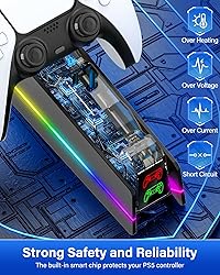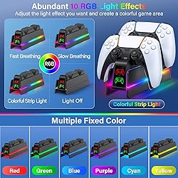 2.5Hrs FAST SPEED PS5 CHARGER FOR PS5 CONTROLLER: The upgraded ZRZLMVP ps5 controller charger is compatible with PlayStation 5 DualSense & DualSense Edge controllers. After the technical upgrade, the ps5 charging station is compact, takes up less space, and uses high-quality copper as the conductive contact point. So the playstation 5 controller charger can safely, securely, and quickly charge dual PS5 wireless controllers in just 2.5 hours simultaneously 9 COLORFUL LED LIGHTING DESIGN FOR PS5 CHARGING STATION: The ps5 controller charger station is specially designed with colorful led lights, which not only add a stylish aesthetic to the PS5 controller, but also create a fantastic atmosphere for your gaming space. 4 lighting modes & 9 colors of lights: 7 x fixed colors, fast colorful breathing lights, slow colorful breathing lights, and colorful strip lights. One-touch control, the ps5 charging dock supports short press for light switching and long press for 3s for light on/off PS5 CONTROLLER CHARGER WITH CLEAR LED INDICATOR: The ps5 controller charging dock has a clear charging indicator light, so you can easily understand the charging status of the ps5/slim/pro controller in real time. CHARGING/STANDBY: RED LIGHT; FULLY CHARGED: GREEN LIGHT. This charger is not only as fast and safe as the official playstation 5 controller charger station, but also more convenient to understand the charging status of the playstation 5/slim/pro controller than the official playstation 5 charger SAFE CHARGING & RELIABLE PS5 CONTROLLER DOCKING STAND: The playstation 5 controller charging station as a built-in smart protection chip that gives the ps5/slim/pro DualSense & Edge controllers protection against overcharging, overvoltage, overheating, overcurrent, and short circuits, etc. When the battery level of the playstation 5 controller reaches 80% then the ps5 docking station stops charging it, so there's no need to worry about leaving your ps5 controller at the ps5 controller charging station overnight ANYWHERE CONVENIENTLY CHARGING PS5 REMOTE CHARGER: The fast charging PS5 controller charging stand is compatible with a variety of power devices, you can easily get power from the front or back of the PS5 / PS5 Slim / PS5 Pro console, PC, the original AC adapter, or output current ≥5V/2A power source devices (AC adapter is not included), etc. via a Type-C cable (included in the ps5 controller accessories kit) MORE THAN JUST A PS5 CONTROLLER CHARGING STATION: The ZRZLMVP ps5 charging station is more than just a ps5 controller charger for fast and safe charging of your ps5 controller, it can also be a ps5 controller holder stand, perfect for storing your 2 ps5 controllers and keeping your ps5 gaming area clean and organized. LED light can bring you into the dazzling world with one click, and become your PS5 accessories kit fashion item. WHAT YOU GET: 1 X PlayStation 5 controller charger, 1 X Type-C cable, 1 X User's manual, 12-month quality support, 7/24h friendly customer service