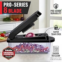 The Original Pro Chopper Refined Since 2013 - Another well marketed lower quality white/black model claims to be the original. More restaurants use Mueller than all the others combined because of our quality.. Effortlessly chop, slice, and dice your ingredients with ease using our tough as nails chopper. It's simple to use, set up, and clean, saving you time and energy during meal preparation. Become a kitchen pro with this must-have kitchen tool. 8 Awesome Blades For the Price of 4 - Two different sized chopper blades and six interchangeable blades for slicing, julienne, grating & shredding offer the functionality of multiple kitchen tools in just one, highly versatile, kitchen gadget. The high-quality stainless-steel blades will create perfectly chopped onions, tomatoes, and peppers for salsa, or shred an entire cabbage for coleslaw in no time. Unmatched Quality - A great pick for holiday exchanges, this kitchen essential makes an excellent choice for white elephant gifts or thoughtful Christmas gifts for women who enjoy cooking. Free-up countertop space with the Food Container. Use the Food Holder while cutting small vegetables and fruits. This prevents food from slipping while slicing it. It also makes it clean, safe, and easy to work with. No more hassles of washing and wiping. Dismantle it and just put it in dishwasher. Make Incredible Meals in Half the Time – Busy lifestyles make us fall into the fast-food trap. It can take a lot of time and effort to dice, chop and slice the ingredients of a desired dish. Do not despair. Our multi-functional tool makes this process less time-consuming making it easier to add vegetables to your meals. That being said, you’re less likely to reach for unhealthy options. From now on, enjoy having more time for your family without missing out on any of the important nutrition. Live Customer Care – Talk to us via out toll-free number or live chat, not by email like our competitors. Mueller believes in making life easier, better and more enjoyable in all that we do. Our unparalleled 24/7 live telephone customer support is ready and waiting to assist with anything you need!