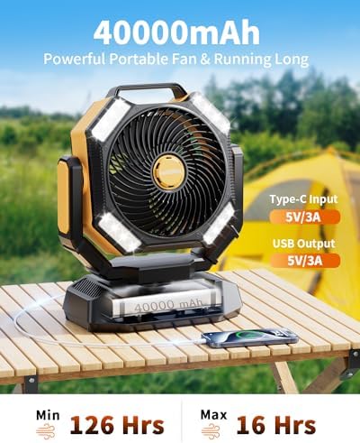 - 40000𝗺A𝗵 R𝗲𝗰𝗵a𝗿𝗴𝗲a𝗯𝗹𝗲 Ba𝘁𝘁𝗲𝗿𝘆: ColdSky battery operated fan features a powerful 40000mAh rechargeable battery. At its lowest speed, it can run continuously for over 120 hours on a full charge. Never worry about running out of battery during outdoor camping, travel, hurricanes, or power outages. It also comes with USB-A and USB-C dual charging ports, providing emergency charging for your electronic devices or camping tools outdoors