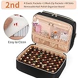 Package Include: 1× nail polish organizer bag + 1× shoulder strap. ▶ Pls Know: All the nail polish & led nail lamp & nail supply & nail kit are not included. For Reference Only Versatile Use: Not only is this nail polish organizer perfect for nail technicians who are on the go, but it's also great for home use, organizing your nail polish collection, and more. It's a versatile and practical solution for anyone who loves manicures Large Capacity --- This nail polish organizer case can hold up to 45 nail polish bottles, a led nail lamp, nail drills, and other manicure tools, keeping your manicure set neat and organized. The bag measures 13.7"×10.3"×9.4" Thick Padding: The surface fabric of the nail supplies organizer is made of quilted nylon, while the inside is filled with sponge. This thick padding material protects your nail polish from hitting and breaking Double Layer Design: This nail polish storage bag features a unique double-layer design, with the upper layer including a 21 slot nail polish organizer board, a large mesh zipper pocket and an adjustable velcro divider that can accommodate nail lamps of different sizes. The lower layer can hold 48 bottles of nail polish and 4 elastic pockets、2 mesh zipper pockets for nail tools Easy to Carry: Featuring a portable handle on the top, a luggage fixing strap on the back, and an adjustable shoulder strap with buckle, this travel nail storage organizer offers three ways to carry your travel nail supply storage case and take your belongings anywhere you want at any time
