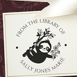 - Make Your Books Uniquely Yours with Our Adorable Sloth Library Stamp. 🦥 This charming self-inking book ownership stamp features a delightful sloth design that brings personality to your precious library. Measuring a perfect 1-5/8", our customized library stamp showcases an endearing sloth hanging from a branch, complete with a sweet bouquet of flowers. Each impression delivers crisp, clear results thanks to our advanced laser engraving technology, ensuring your mark of ownership is always pristine and professional. Choose from 11 vibrant ink colors to match your style, housed in a sleek self-inking case available in Midnight Black, Flame Red, or Sky Blue. Built to last, each stamp delivers up to 10,000 impressions before needing a refill, and the ink pad is easily replaceable for continuous use. bibliophiles, teachers, and librarians alike, this custom-made book logo stamper does more than just mark ownership – it adds a whimsical touch to your collection while gently encouraging borrowed books to find their way home. Whether you're organizing your home library, preparing book gifts, or lending to friends, this stamp combines functionality with charm. The easy press-and-print mechanism ensures consistent results every time, while the self-inking feature eliminates the need for separate ink pads. Simply personalize with your name or chosen text, and you're ready to start making your mark on your literary world. Transform your book collection today with this delightful sloth stamp – where practicality meets personality in perfect harmony. It's more than just a stamp; it's a statement of your love for books and attention to detail that makes your library uniquely yours.
