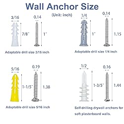 Multi-Size Drywall Anchor Kit - Includes 4 versatile sizes (3/16"×7/8", 1/4"×1", 5/16"×1-1/5", 1/2"×1-3/5") for light to heavy-duty projects. All-in-one solution for hanging shelves (15-70 lbs), mirrors, pictures, and garage storage. Heavy-Duty Construction - Reinforced nylon anchors + 304 stainless steel screws resist corrosion/rust. Holds 2X stronger than basic plastic anchors—ideal for drywall, plasterboard, concrete, brick, and wood walls. Smart Organized Storage - Durable compartmentalized box with labeled grids for instant size identification. Space-saving design keeps 178 pieces (89 anchors + 89 screws) tidy in toolboxes or drawers. Easy Installation - Self-Drilling Drywall Anchors (included) & self-tapping screws enable quick mounting. Perfect for professionals and DIYers tackling curtains, towel racks, or photo galleries. Lifetime Supply Value - Sufficient quantities of each size for future projects, no need to repurchase for small home upgrades.