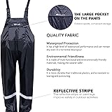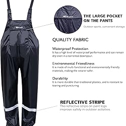 FULLY WATERPROOF:Work pants for men made from PVC-coated polyester fabric that protects against rain, snow, fog, and ground humidity for work, hunting, fishing, or sailing STAY DRY:Safety overalls are 100% waterproof and windproof with heat-sealed seams FUNCTIONAL:Rain pants feature button adjustment at waist, side gusset with snap closure, quick release buckles.Adjustable elastic suspenders PROTECTED NO MATTER WHERE ADVENTURE TAKES YOU:This bib pants provides fisherman the lower-body pro¬tection they demand with the freedom and comfort to fish hard all-day long OCCASIONS: lightweight rain pants are great for golf, fishing hiking, mountaineering, wading work, biking, golf, camping, fishing, work, boating, walking, horseback riding, hunting, jogging, boating, dog walking,other outdoor rain activities and daily wear