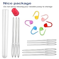 1. DURABLE: Lightweight, stable, don't rust or bend and the tips are smooth,it will last for a long time 2. DIFFERENT SIZES: The large eye stitching needles include 3 sizes, 5.3 cm, 6 cm, 7 cm, total 9 pcs blunt needles, 2 Pcs Needle threader, 6pcs Locking Stitch, perfect sizes of yarn knitting needls for you to choose to finish your project 3. EASY TO HANDLE: The knitting needles with extra long eye, blunt tip and thick shaft, easy to thread yarn, the stitching needles are easy to thread yarn through even without a threader.It is also called tapestry, darning or finishing needles 4. WIDE APPLICATIONS: The darning needles have different length to meet your different usages in hand sewing, embroidery, and widely used for knitting, crocheting, leather working, shoes repairing etc 5. GREAT GIFT IDEA: Our knitting needles set is suitable for any weave DIY lover or beginner,large-eye blunt needles are come with a clear bottle, are suitable for weaving in ends and sewing up seams on your knit & crochet projects