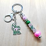 Unique ALPHA Sorority Keychain with ALPHA letter Symbol and SKEEWEE pendant, adorned with sparkling crystal rhinestones for a touch of elegance and style. Perfect for sisters' celebrations and graduation gifts. High-quality alloy and rhinestone construction ensures durability, resistance to rust and tarnishing, making it a lasting keepsake for any sorority member. Show your pride and connection to your sorority with this stylish piece featuring a decorative Greek letter design with rhinestone inlays and enamel color accents. Delve into history and tradition with a beautifully crafted metal and colorful keychain showcasing African women, the pink green sorority society symbol, and ALPHA sorority society label . A unique and meaningful addition to any collection. Versatile and chic, this keychain is a must-have accessory that combines fashion-forward design with a hint of sophistication. An essential piece for any jewelry enthusiast.