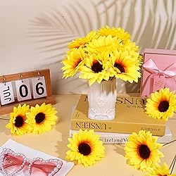- Features:Versatile applications:The artificial sunflower head is lifelike in appearance and bright in color, you can apply them on tables, balconies, mantels, bedside tables, shelves, etc., which will add a vibrant and relaxing atmosphere to these places.Easy to care:These silk fabric sunflower heads do not need water, sunlight or fertilizer, they will not fade and wilt. So you can give them as gifts to your family members or friends, which will surprise them.Specifications:Color: yellowMaterial: silk cloth and plasticSize: approx. 4.1 inchPackage includes:80 x Artificial sunflower heads80 x Flower StalksNotes:It may be slightly compressed during transportation. Just straighten the petals, you can easily restore their correct shape.Please allow a little error on the size due to manual measurement.The colors may exist slight difference due to different screens.