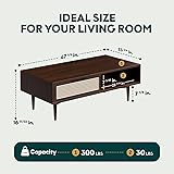 ELEGANT DESIGN: Mid-century modern style blends seamlessly with boho and farmhouse interiors; A minimalist silhouette enhances both function and elegance in living room; Ideal as a coffee table or side table living room centerpiece BOHO RATTAN ACCENT: The solid wood side table brings texture and warmth to any space; Ideal as a living room table or side table, this rattan table enhances the visual appeal with its rich texture, handcrafted detail, and natural charm VERSATILE STORAGE: Features 2 enclosed compartments for storing essentials like books, remotes and decor; Whether in the living room, bedroom or office, our rattan coffee table offers a clean, minimalist way to tuck away daily items EASY-GLIDE DRAWERS & ADJUSTABLE LEVELERS: The drawers slide smoothly on quality rails - no sticking or jamming; Equipped with adjustable levelers, the side table with drawers stays stable on uneven surfaces and helps protect floors from scratches QUICK ASSEMBLY: This wooden coffee table comes semi-assembled - just attach the legs and it's ready in minutes; An ideal fit for your living room, home office, as a side table with storage or storage cabinet in both large and small spaces