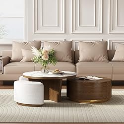 Lartis Coffee Table Set 2 - Walnut Coffee Table with Drawer and Stools - Marble Circular Stone Tabletop Modern Design Round Coffee Table for Living Room