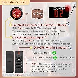 [Simple Number System] This queue call system is suitable for the scenario where each counter handles the same business. The display can alert customers who are waiting for service that it's their turn, and go to any available counter. Improve efficiency and save customers' time. [Clear LED Number Display] The display uses outdoor high-brightness lamp beads to avoid unclear vision when viewed from a distance. The signal range is up to 150m (500ft) in an open area and 30-50m (100-160ft) in obstacle field. [Long Time Display] When you press the CALL key, the display will broadcast "Next customer, please go to counter X". The counter number will remain displayed until the CANCEL key is pressed. So there is no need to worry about the customer missing a call. [Plug and Play] The counter call system does not require a network connection and does not cost anything. We've paired the button transmitter with the display receiver before shipping, it is ready to use when connected to a power source. [Multi-Scenario Application] Clinics, banks, service hall, phlebotomy centers, offices, nail salons, hairdressers, or other noise places that require lines.