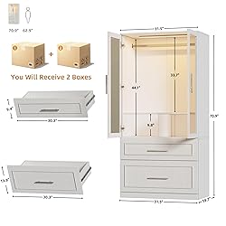 - This PAKASEPT wardrobe closet with Doors provides ample space for storing your most treasured items, with beautifully designed simple wooden closet cabinet with glass door that will add a touch of elegance to your bedroom or living room.The high wardrobe and storage cabinet are designed to meet a large number of storage needs, with dimensions of 70.9 inches high x 31.5 inches wide x 19.7 inches deep. The suspension rod provides a convenient length hanging space, which is very suitable for storing longer items such as dresses, suits, pants, etc.large drawer is an ideal choice for storing sweaters, linen, toys, and more.What's Included?1 x Wardrobe Closet1 x Assemble Instruction1 x Installation ToolsDescription:Material: MDF + MetalArmoire Wardrobe Closet Size : 19.5"L x 31.5"W x 70.9"H.Armoire Wardrobe Closet Weight: 112.2lbs
