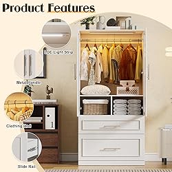 ▶Large Capacity Storage Space: The white armoire wardrobe closet features 1 hanging bar, 2 drawers, 2 storage shelves. The suspension rod provides a convenient length hanging space, which is very suitable for storing longer and wrinkle-prone clothing; 2 storage compartments to store blankets, pillows, bags, and more; large drawer is an ideal choice for storing sweaters, linen and more. ▶Wardrobe closet with Light: Wardrobe closet with variable induction mode LED lights, control the different modes of lighting effects, color temperatures and brightness you want by the buttons on the side of the lamp. Like all-day induction mode ( it will automatically light up when it senses people), night induction mode (in low light conditions, it will automatically light up when it senses people) and constant light mode. The motion induction mode will automatically turn off the light 7-8 seconds after people leave. This LED armoire with drawers can enrich your bedroom space and can also be used as a night light to avoid darkness. ▶Wireless Installation Cabinet Light: Equipped with USB-C fast charging rechargeable batteries, and it only takes 3 hours to fully charge. It can be used continuously for up to 60 days in induction mode and up to 9 hours in constant light mode. Enjoy worry-free, reliable lighting without wire interference, and say goodbye to cumbersomeness. (Please use the charging cable we provide. Other cables may not be compatible and may cause charging failure.) ▶Stable & Durable: PAKASEPT armoire wardrobe closet with hanging rod is constructed with quality MDF board mainly and particle board, with timeless freestanding structure makes it stable and durable. Light wood grain surface features a modren and stylish, it can be easily matched with any furniture in your room and add an elegant & noble charm to your bedroom. ▶Multiple Uses: This wardrobe and storage cabinet serve various purposes, commonly used as storage cabinets for living room wardrobes, bedroom wardrobes, office wardrobes, storage cabinets, file storage cabinets, office, home, school, archives, fire administration, garages, basements or anywhere secure storage space is required. ▶Easy to Assemble: Designed with your convenience in mind, our wardrobe closet is easy to assemble. Detailed instruction and tools are included in the package, all pieces are well labeled, it would be clear to assemble, you'll not get stuck with the assembly, if you have any questions, please feel free to contact us.