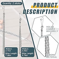 Plenty of Quantities: the package consists of 2 pieces of wire pulling grips, offering not just a single solution but also a spare for unexpected situations; Sharing with colleagues or friends is also possible, thereby increasing efficiency and camaraderie in the process Ideal Size: before you purchase, ensure to check the relevant sizes; With a maximum diameter about 0.39 inches and a grid length about 5.74 inches, the cable pulling grip is proficiently designed for pulling the wires up to 1/2 and 3/4 inches in diameter Thoughtfully Engineered: the mesh cable pull features an eye-friendly mesh design, which includes a single wave of galvanized mesh cable socks; This design is aimed to provide safety for cables from getting scratched, assurance against slips, and ease in pulling cables through pipes or walls Protection from Rust and Corrosion: the cable pull net features galvanized steel manufacturing, which ensures sturdy and safe cable pulling; Both features, corrosion and rust resistance, safeguard optimal durability and ease of use for an extended time Suitable Cable Socks: these cable puller socks have been specially designed to be a reliable tool for electricians; These are soft and flexible (but remember, bending them at right angles is not recommended) and provide a secure grip in pulling wires and cables; The cable swivel head design further reduces cable twisting