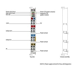 - Technical data EL9410 Technology power supply terminal Short-circuit proof yes Input voltage 24 V DC (-15%/+20%) Input current typ. 70 mA + (E-bus/4) Output voltage 5 V for E-bus supply Output current 2 A Current consumption E-bus – Electrical isolation 500 V (E-bus/field potential) Power contacts max. 24 V DC/max. 10 A Diagnostics in the process image yes Special features standard EL supply Weight approx. 65 g Operating/storage temperature 0…+55°C/-25…+85°C