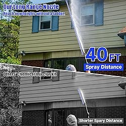 【Greatly enhances cleaning efficiency】The maximum spray distance of Long Range Nozzle is up to 40ft or more and doesn't need to use a ladder to reach the top of a two-story house. Greatly enhances cleaning efficiency. Flow: 4-4.5 GPM / Pressure: 2500 to 4000 PSI 【Reduced Corrosion from Downstreaming】The long range chemical nozzle features a universal 1/4" quick connector that can be connected to the outlet of the pressure washer or wand. This adjustable pressure washer long range nozzle reduces the likelihood of corrosion developing and damaging the pressure washer equipment by preventing chemicals from going through the pump, hose, reels, lance, or quick connects. 【Adjustable angles and usage mode】The downstream injection nozzle Kit features adjustable spray angles and dual usage modes. The power washer chemical injector features a variable nozzle at the outlet and can adjust the spray pattern from 0 to 65 degrees. The upgraded shut-off valve can switch soap and rinse modes in the same nozzle. The nozzle can also be used in the rinse mode to water vegetation, and flowers or wet down other surrounding surfaces. 【Great Cleaning efficiency】The pressure washer chemical injector kit can dispense highly concentrated chemicals at an efficient. The pressure washer injector includes a black proportioner, so users can control the desired mixture ratios. Ball strainer screens can reduce injector clogging, and upgraded stainless steel clips can be used to connect hoses and nozzles for secure installation and to prevent leaks, saving time and effort. 【Wide Application】FIXFANS downstream injector for pressure washer kit can be widely used to wash Cars, Motorcycles, Floors, Windows, Driveways, Roofs, Siding, pools, and so on.