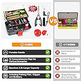 【6X Larger Tackle Box Organizer】- TCMBY 3 layers tackle box boasts a spacious 11.0*5.5*5.1 inch capacity, which is 6X Larger than most tackle boxes, offering ample storage. Detachable grids enable organized storage of fishing accessories, eliminating clutter and providing quick access. The extra space allows for personalized fishing gear, catering to individual preferences. The portable handle makes it perfect for fishing trips, cementing its status as the ideal choice for anglers. 【Comprehensive Fishing Kit】 - It's a complete package with essential tools like pliers and a fish gripper, plus a full set of fishing accessories. It simplifies preparation, making fishing more hassle-free for impromptu trips. The tackle box with tackle included 1 plier and gripper, 2 crankbaits, 1 popper, 1 minnow, 1 pencil, 1 frog, 36 soft lures, and a box of 100 fishing hooks. It also features 40 offset worm hooks, 13 jig heads, 79 weights, and more to cater to diverse fishing needs. 【Enhanced Comprehensive Fishing Tackle】 - The upgraded 2024 fishing tackle kit offers a comprehensive set of 16 fishing rigs, a 50% increase compared to standard tackle box kit. The expanded selection includes 12 lure rigs and 4 bait rigs, and the kit features an impressive lineup of rigs, including Texas, Carolina, Florida, Wacky, Drop Shot, Jig Head, and Ned rigs, catering to the needs of bass and other freshwater fish. This makes it an all-inclusive upgrade for your fishing adventures. 【Exceptional Fishing Gear and Equipment 】 - The TCMBY fishing lure kit features lifelike lures including minnow, popper, pencil, and crankbait, equipped with 3D eyes and ultra-realistic patterns to fool even the most cautious fish, boosting your success. Our stainless steel equipment is rigorously tested for superior corrosion resistance, and the robust ABS construction makes the fishing tackle box highly resistant to impact and wear, ensuring stability and durability for long-lasting use. 【Ultimate Fishing Gift】 - The TCMBY Fishing Kits, with its stylish design and comprehensive fishing equipment, makes it the ideal selection for discerning anglers. It's a perfect, high-value gift for beginners and enthusiasts alike on holidays or special days like Father's Day, Valentine's Day, Thanksgiving, Christmas, and birthdays. Suitable for husbands, fathers, or brothers, its thoughtful design and complete fishing tools are sure to delight and satisfy the recipient.