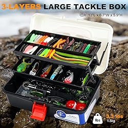 【6X Larger Tackle Box Organizer】- TCMBY 3 layers tackle box boasts a spacious 13.0*6.7*5.9 inch capacity, which is 6X Larger than most tackle boxes, offering ample storage. Detachable grids enable organized storage of fishing accessories, eliminating clutter and providing quick access. The extra space allows for personalized fishing gear, catering to individual preferences. The portable handle makes it perfect for fishing trips, cementing its status as the ideal choice for anglers. 【Comprehensive Fishing Kit】 - It's a complete package with essential tools like pliers and a fish gripper, plus a full set of fishing accessories. It simplifies preparation, making fishing more hassle-free for impromptu trips. The tackle box with tackle included 1 plier and gripper, 2 crankbaits, 1 popper, 1 minnow, 1 pencil, 1 frog, 36 soft lures, and a box of 100 fishing hooks. It also features 40 offset worm hooks, 13 jig heads, 79 weights, and more to cater to diverse fishing needs. 【Enhanced Comprehensive Fishing Tackle】 - The upgraded 2024 fishing tackle kit offers a comprehensive set of 16 fishing rigs, a 50% increase compared to standard tackle box kit. The expanded selection includes 12 lure rigs and 4 bait rigs, and the kit features an impressive lineup of rigs, including Texas, Carolina, Florida, Wacky, Drop Shot, Jig Head, and Ned rigs, catering to the needs of bass and other freshwater fish. This makes it an all-inclusive upgrade for your fishing adventures. 【Exceptional Fishing Gear and Equipment 】 - The TCMBY fishing lure kit features lifelike lures including minnow, popper, pencil, and crankbait, equipped with 3D eyes and ultra-realistic patterns to fool even the most cautious fish, boosting your success. Our stainless steel equipment is rigorously tested for superior corrosion resistance, and the robust ABS construction makes the fishing tackle box highly resistant to impact and wear, ensuring stability and durability for long-lasting use. 【Ultimate Fishing Gift】 - The TCMBY Fishing Kits, with its stylish design and comprehensive fishing equipment, makes it the ideal selection for discerning anglers. It's a perfect, high-value gift for beginners and enthusiasts alike on holidays or special days like Father's Day, Valentine's Day, Thanksgiving, Christmas, and birthdays. Suitable for husbands, fathers, or brothers, its thoughtful design and complete fishing tools are sure to delight and satisfy the recipient.