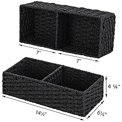 【SAFE & PREMIUM MATERIAL】Black wicker baskets for storage is hand-woven with 100% round paper rope by our professional weaving workers. Small storage basket is constructed with a sturdy metal frame inside for durability 【VERSATILE STORAGE】Versatile toilet paper basket for storing tissues and personal care in bathroom, or remotes, CDs, office essentials, and small items in daily life. Ideal for extra storage in bathroom, living room, kitchen, office, etc 【PRACTICAL DESIGN & SIZE 】2 large separated sections help you classify and organize different items. Baskets for shelves comes in a set of 2, and each dimension is 14 ¼"L x 6 ¼"W x 4 ¼"H, size may vary within 1/4 inch due to handwoven design 【REDEFINE YOUR HOM】Black baskets for storage fit well with most home decor and keeps a clutter-free space, adding funny texture to reduce clutter on shelves or countertops. It will be the perfect finishing touch to your home 【CUSTOMER SATISFACTION】Have any questions, comments, or concerns about your bathroom basket? Our customer satisfaction team is purr-fectly happy to give you a helping hand