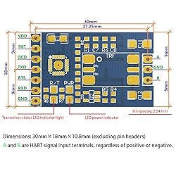 - HART host module 5700 uses an AD5700-1 HART chip, with isolation, surge protection, impact protection, overvoltage protection, reliable and stable performance, clean and smooth output waveform, TTL serial port output, and simple control. It can be directly connected to the instrument for testing, which is convenient for secondary development.One end of this product is a standard UART serial port interface, and the other end can be directly connected to the HART instrument, so this product does not provide a schematic diagram.Pin Introduction 1. The A and B ends are not positive or negative and can be directly connected to the load resistor of the HART smart transmitter. 2. RST reset pin, usually directly connected to the power supply. 3. RXD, TXD, OCD, and RTS are connected to the TTL serial port. 4. OCD is the serial port carrier detection, usually not connected. OCD is 1, indicating that the input waveform amplitude is greater than 120mV, and OCD is 0, indicating that it is less than 80mV. 5. RTS is high level, the module is in demodulation mode, otherwise it is in modulation mode. When connected to a single-chip microcomputer, it can be connected to an IO pin. 6. R/T is the transceiver indicator light, and the blue LED flashes when working. 7. PWR is the power indicator light, and the red LED is always on after the power is turned on. 8. Input power range: 2V~5.5VDC. (It is generally recommended to use 3V, 3.3V, 3.6V or 5VDC) Function introduction 1. PWR is the power indicator light, red, always on when the power is turned on. 2. R/T is the receiving and transmitting status indicator light, blue light, flashing when working. 3. Bias output, stable signal, effectively filtering out background noise. 4. 1:1 electromagnetic isolation of input and output signals. 5. High-efficiency TVS tube two-stage surge and impact protection. 6. 50V, ESR DC-isolating coupling capacitor effectively protects input and output safety and has the function of protecting the power line from connection. 7. Can directly connect USB to UART or RS232 to UART interface chip and make a homemade HART modem. 8. Can be used for homemade handheld operator. 9. Can be connected to a single-chip microcomputer for system integration, used for process control of HART function.