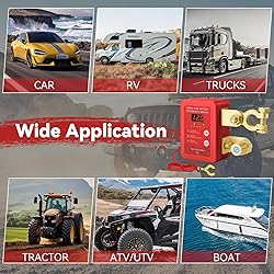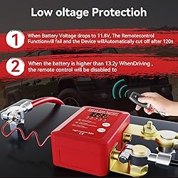 【Smart Kill Switch】If the voltage is lower than 11.8V, the remote kill switch will automatically cut off the power supply after 120s to save electricity, if the voltage is higher than 13.2V, the remote control will be disabled to prevent accidental action to shut off the power while driving, and the power supply can only be controlled by the button on the switch 【Extend Car Battery Life】This kill switch for a car can avoid car battery depletion due to long-term parking, line aging, forgetting to turn off the lights, and other reasons. effectively protect and extend the life of the car battery 【Wide Application】This kill switch Suit for most 12V cars, boats, RVs, trailers, trucks, ATVs, UTVs, motorcycles, and vehicles with a rated battery current below 240A 【Lower Consumption】 This product uses a mechanical magnetic switch with a standby current of only 3mA, completely solving the problem of parking power consumption 【What You Get】Cut off Switch x 1, Remote controller x 2, Manual x 1, Nut x 1, Gold spacer x 1