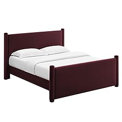 Modway Rael Queen Platform Bed Frame with Upholstered Headboard and Footboard in Mulberry – Stain-Resistant Performance Velvet Queen Size Bed with Rounded Posts