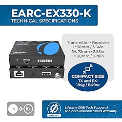 AUDIO ONLY EXTENDER : eARC, ARC & SPDIF Optical Extender - Long Range Over CAT5e/6/7 LAN Cable up to 33 feet (196 Khz). eARC Supports PCM 2./5.1/7.1ch, Dolby Digital/Plus, Dolby TrueHD, DTS, DTS-HD MA,, Dolby Atmos. The device comes with a dual voltage supply using a US plug, and an adapter/converter is provided for international use. This is a fantastic plug and play solution for sending eARC HDMI or ARC and SPDIF audio from athe TV back to your Amplifier in the media closet. The eARC-EX33-K can transmit HDMI eARC/ARC and S/PDIF audio signals up to a distance of 15m/492ft (96kHz) or 9m/295ft (192kHz) over a single CAT cable. Supports PCM 2.ch, Dolby 5.1 CH Audio Formats. CEC Pass Through between HDMI eARC Input port and eARC Output Port. TV without ARC port, the extender provides and independent S/PDIF audio passthrough channel to transmit S/PDIF audio from the Optical in port on the Transmitter to the optical pout port on the Receiver. Package Includes - HDMI Transmitter, HDMI Receiver, IR Cables, Manual, 2x Adapters. Full OREI Support - 1 Year Warranty