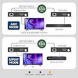 - ARC & SPDIF Optical Extender - Long Range Over CAT5e/6/7 LAN Cable up to 300 feet (196 Khz). This isa fantastic plug and play solution for sending HDMI arc and SPDIF audio from athe TV back to your Amplifier in the media closet.Supports PCM 2.0ch, Dolby 5.1 CH Audio Formats. CEC Pass Through between HDMI ARC Input port and ARC Output Port. TV without ARC port, the extender provides and independent S/PDIF audio passthrough channel to transmit S/PDIF audio from the Optical in port on the Transmitter to the optical pout port on the Receiver. Perfect professional distribution solution - ideal for your TV Audio | Heavy-duty cool metal enclosure protects the insides and keeps the unit cool by aiding in quick heat absorption and dissipation & Compact in size for easy plug & play installation, Full HDCP Compliant