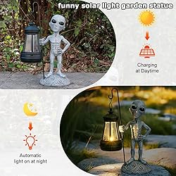 - Add a touch of interstellar wonder to your outdoor space with our Alien Garden Outdoor Statue—a quirky fusion of sci-fi charm and functional décor! Handcrafted from high-quality resin and meticulously hand-painted in sleek gray tones, this alien garden statue depicts a whimsical extraterrestrial standing proudly on the moon. Measuring 4.1" (L) x 8.1" (H) x 3.5" (W), this outdoor figurine for yard patio lawn features intricate details: the alien strikes a playful pose with one hand on its hip and the other holding a solar-powered lamp, its eyes gazing curiously forward.By day, this solar light-powered yard decoration captivates with its quirky design; by night, the built-in LED lamp glows softly, casting an otherworldly ambiance across gardens, pathways, or porches. The weather-resistant, UV-protected resin ensures durability, making it perfect for outdoor garden or lawn decor year-round.A standout alien gift for women or men, this statue appeals to UFO enthusiasts, pop-culture lovers, or anyone seeking a conversation-starting decoration statue. Whether displayed on a front porch, patio, or shelf, it blends humor and artistry seamlessly.✨ Key features:Solar-powered lamp for eco-friendly illuminationAlien garden figurine with dynamic, hand-painted detailsCompact size ideal for yard decoration or indoor displaysDurable resin construction for all-season use🎁 Perfect for: Birthday gifts, housewarming surprises, or adding a dash of cosmic flair to your outdoor garden!Light up your space with this alien stuff lantern—where imagination meets interstellar style! 👽🌌
