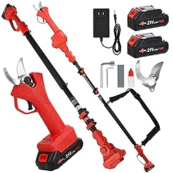 Significant Upgrade: The battery capacity has been substantially increased to 4,000mAh, delivering outstanding battery life. Additionally, we've thoughtfully included a replacement blade to ensure a consistently fresh experience for you 2-in-1 Rotating Telescoping Pole: The telescoping pole can extend from 5 feet to 9 feet, reaching up to 15 feet when held by a user who is 6 feet tall, allowing you to trim both high and low areas without the need for a ladder; the hedge trimmer head features an 180° rotation button, which allows you to adjust the trimming angle as needed High-Efficiency Cordless Pruner: The electric pruning shear is equipped with a powerful 1300w brushless motor. It comes with 2 rechargeable 21V 2000mAh lithium-ion batteries, providing ultra-long standby time and allowing for 6-8 hours of continuous use on a full charge. (Note: If not used for a long time, please charge the batteries once every 2-3 months to maintain their activity Safe Operation: To start the machine when you turn on the power switch, you need to quickly pull the trigger twice (you will hear a "beep" sound). Please note that if you pull the trigger slowly, the safety switch will not activate. If the trigger is not pressed within 60 seconds, the pruning shear will enter automatic sleep mode to prevent accidental cutting. Pressing the trigger twice will restart the tree branch cutter Maximum Cutting Diameter of 30mm (1.2 Inch): The blade of the cordless tree pruner is forged from SK5 high-carbon steel, which is sharp and rust-resistant. It allows for quick, clean, and flat trimming without damaging the branches, capable of cutting branches up to 1.2 inch/30mm in diameter Comprehensive Accessories: Our electric pruning shear set includes: Rotating Telescoping Pole, 2*21V2000mAh Battery, Battery Charger, User Manual,Electric Pruning Shears,Lubricating oil,Whetstone,Protective tape, Hex wrench