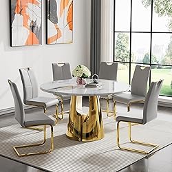 【7 Piece Dining Table and Chair Set】This home 7 piece dining table set includes: 1 x 45inch round dining table and 6 x PU dining chairs. Round dining table and chair combo are suitable for 6 people at a time. Compact modern kitchen table set, not only to provide dining functions, but also compatible with different decoration styles. 【45'' Round Faux Marble Dining Table】Round thicken MDF tabletop, thickness,is sturdy.The the strong stainless steel legs have a firm grip with the help of the top, making the table as a strong and reliable option for long time. And the round dining table is ideal for any dining room Set, giving a clean and polished look to any room, with its high glossy base and white table Top. 【Soft PU Leather Dining Chair】Our dining side chair is made of premium pu leather and C-shape metal frame, and the overall chair is skin-friendly and smooth surface. Each chair can bears 280 pounds. Comforable dining room table set, it is a perfect gift for family and friends. 【Round Kitchen Table Set Suit for 6】This kitchen table and chair set is ideal for family and friends for daily meals and gatherings. We have a variety of different color matches, you can choose the set you want to match your home decoration style. The dining table and chair set can be used in the home, kitchen, living room and dining room. 【Easy Assembly】A simple installation is required, and you can quickly complete the assembly with instructions. If the product you received has no screws or is incomplete or damaged, please tell us promptly by message center for replacement.