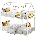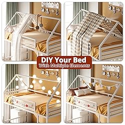 Space-Saving Design: With dimensions of 76.8'' L x 40.7'' W x 71.7'' H, this twin-over-twin floor bunk bed is perfect for compact spaces Sturdy and Durable: Crafted from a solid metal frame, this bunk bed ensures durability and reliability in your bedroom, featuring high guardrails on the upper bed for safety Creative House Design: The whimsical house-shaped structure adds charm and character to your bedroom. Its simple yet captivating appearance offers a canvas for creativity, allowing you to decorate and unleash the imagination Easy Assembly: Everything you need for assembly, including parts, tools, and instructions, is conveniently packaged in one box, making setup a breeze Easy to Match: The clean silhouette and elegant design of this metal twin bunk bed, complete with a ladder, effortlessly complement any room's aesthetic, blending modern style with timeless appeal