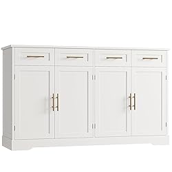 - HOSTACK 60" Wide Modern Kitchen Buffet Sideboard Cabinet Brings a relaxed and airy feel to your home with its popular Hamptons style Features: - 4 Deep, Easy-glide Drawers - Anti-tipping Hardware - Exquisite Metal Handles - Elegant Bevelled Base - 60" Spacious Tabletop - Extra Tall Body - 4-Door Cupboard each with Internal Fixed Shelf Specifications: - Color: White + Gold Handle - Material: MDF Wood - Overall Size: 15.75" D x 60" W x 36.02" H - Overall Weight Capacity: 450 lbs What's in the box: - 1x Large Kitchen Cabinet - 1x Step-to-step Instructions - 1x Accessories Bag