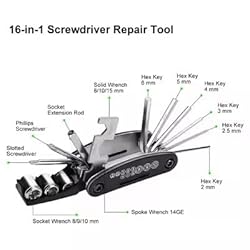 16-IN-1 MULTIFUNCTION TOOL: Includes hex wrenches (2mm, 2.5mm, 3mm, 4mm, 5mm, 6mm), solid wrenches (8/10/15mm), socket wrenches (8/9/10mm), Phillips and slotted screwdrivers, spoke wrench (14GE), and a socket extension rod. DURABLE CONSTRUCTION: Made from high-quality 45# steel with a chrome-plated finish for long-lasting performance and corrosion resistance. COMPACT AND PORTABlE: Lightweight and foldable design fits easily in your pocket, saddlebag, or backpack for on-the-go repairs. ESSENTIAL FOR CYCLISTS: Perfect for quick adjustments and repairs on mountain bikes, road bikes, folding bikes, and more. ERGONOMIC DESIGN: User-friendly layout ensures easy access to all tools, making repairs hassle-free. IDEAL GIFT FOR CYCLISTS: A must-have accessory for cycling enthusiasts, commuters, and adventurers. COST-EFFECTIVE SOLUTION: Replaces the need for carrying multiple separate tools, saving space and effort.