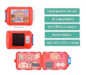 - UNIQUE DESIGN: a souvenir magnet with a memorable image and a small pocket-size pill dispenser featuring a beautiful painting collage image of Orlando, Florida. EFFICIENT TRAVEL PILL ORGANIZER: This portable pill organizer is ideal for storing pills, supplements, or vitamins. It includes ten separate compartments, making it perfect for organizing medication for several days. PILL CAPACITY: The organizer has 10 separate compartments, each capable of holding up to 5 average-sized pills. MAGNETIC: The pill box is equipped with a strong embedded magnet, allowing it to attach to magnetic surfaces such as a fridge, microwave, or magnetic calendar. This helps keep your daily medication or supplement regimen visible and accessible. CLEANING: Wash or sanitize before initial use and allow dry completely before using. WARNING: This product is neither child resistant nor a toy. The pill compartment’s closures are not child resistant. Keep it out of the child’s reach.