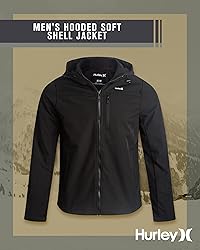 - Upgrade your outerwear collection with the Hurley Men's Hooded Soft Shell Jacket, a seamless blend of style and performance. Designed for the modern man, this soft shell jacket mens features a water-resistant finish, keeping you dry during light rain and protecting against windy days. Its lightweight 3-layer construction includes a microfleece backing, providing warmth and comfort without adding unnecessary bulk. Whether you're searching for casual jackets for men or outdoor jackets for men, this versatile design is tailored to meet every need. The full zip front ensures ease of wear and a secure fit, while functional welt hand pockets and a contrast chest pocket combine utility with style. The straight hem and adjustable hood make this jacket for men a reliable option for unpredictable weather. Whether you're heading out for a city stroll, an outdoor adventure, or a casual outing, this mens lightweight jacket is built for active lifestyles and everyday versatility. Perfect for transitional seasons, this hooded jacket for men effortlessly adapts to your wardrobe from breezy spring mornings to crisp fall evenings. Its sleek, modern design pairs well with any outfit, making it a top pick for those seeking mens jackets casual stylish or mens softshell jackets. Discover the ideal combination of performance and style with this must-have men’s jacket, available in sizes S-XL.