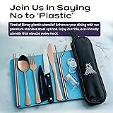 - Upgrade your travel dining with the Taplord Portable Travel Silverware Set Bundle, featuring two complete 10-piece sets in Black and Rose Gold. Made from durable stainless steel, these reusable utensils are perfect for camping, office, picnics, and on-the-go meals. Each set includes a fork, spoon, knife, chopsticks, straws, and a compact carrying case for easy portability. Designed for convenience and sustainability, this bundle offers a stylish and eco-friendly alternative to disposable cutlery. Stay prepared wherever you go with this must-have travel utensil set!