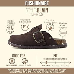 - Step into comfort and style with CUSHIONAIRE Blain Genuine Suede Clogs for Women, designed for those who love the perfect blend of fashion, durability, and support. These womens clogs feature a soft genuine suede upper, ensuring breathability and an elegant look that complements any wardrobe. The oversized buckle detail adds a touch of rustic charm, making these a go-to choice for casual outings, workwear, or lounging at home. The memory foam insole delivers exceptional cushioning, reducing foot fatigue and providing arch support. Whether you need clogs for women for daily errands, long work shifts, or travel, these are built to keep your feet comfortable all day. The lightweight, non-slip outsole ensures reliable traction, making them ideal for both indoor and outdoor use. If you’re searching for womens mules & clogs, these platform clogs for women offer a modern aesthetic with timeless comfort. The slip-on design allows for quick and easy wear, while the durable construction ensures long-lasting performance. Unlike traditional suede clogs or platform clogs, these provide enhanced support and flexibility, adapting to your foot’s natural movement. Perfect for multiple settings, these clogs for nurses, teachers, and women on their feet all day help prevent strain and discomfort. The breathable suede material keeps feet fresh, while the plush lining ensures a cozy feel in cooler months. Whether you're looking for suede clogs for women, womens slip-on mules, or simply a trending shoe for 2024 or 2025, these versatile mules are a must-have. Available in black, brown, chestnut, sand, khaki, and taupe, these womens clogs and mules can be styled effortlessly with jeans, leggings, or even business-casual attire. From errands to weekend outings, these stylish yet functional clogs for women fit every occasion.