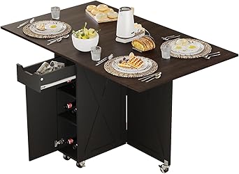 Space Saving Dining Table: The drop leaf table easily folds and extends to suit needs, perfect for small spaces or apartments. Fully extended it serves as a dining table for 4-6 people. With one side folded, it doubles as an office desk or can be placed by a kitchen island for extra space. When not in use, it folds compactly for easy storage in an entryway or corner, maximizing space. Multifunctional Folding Dining Table: The folding dining table's unfolded size is 52.7"W×31.5"D×30"H, and it can easily accommodate 4 people. The folding dining table's measured in 31.5"×30.1"×30" when unfolded on one side. In this mode, it can be easily used for work, study, sewing. The size of the folding dining table's 9.05"W×31.5"D×30.1"H when it is all folded, which is small and easy to store, and can also be used for entrance tables and sofa tables. Convenient Design: The mobile folding table also has six 360-degree rotating wheels, four of them is lockable for easy movement and fixation at any time. On the front of the table there is a drawer and cabinet for storing wines and tableware, with a removable bottle holder, so that belongings can be stored in a specific place for convenience. On the back, there are double-layer storage cabinets with anti-drop metal frames, which are enough to meet needs of storage and make home tidier and neater. Sturdy and Stable: The folding dining table is composed of high-grade engineered wood, which is durable, easy to clean, and has a long service life. Whether at home or in the office, it can fit into different environments, meet needs, and make life easier. Easy Assembly: The folding dining table's package includes clear instructions, numbered parts, and pre-drilled holes for quick and accurate setup.