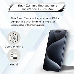 Compatible Model: This back camera replacement ONLY compatible for iPhone 15 Pro Max Models: A3106 A2849 A3105 A3108. Limited to certain models. Ensure your cell phone’s model matches before you buy this. Improved: For iPhone 15 Pro Max main rear back camera replacement with 4K video recording at 60 fps, Time-lapse video with stabilization, 5x optical zoom in, 2x optical zoom out, Three cameras (48MP Main, 12MP Ultra-wide, 12MP Telephoto), 0.5x, 1x, 5x optical zoom options, Smart HDR 5 for photos, Night mode portraits. Effectively replace defective cameras. Repair Broken Camera: The main back camera replacement for iphone15promax fixes rear camera problems such as cracked lenses, dark images, fuzzy pixels, small dots, color warping, and others. Support: We strictly test each package before it’s sent to guarantee perfect equipment for you. After delivery, contact us anytime for more professional responses. Tip: Before proceeding with installation, we suggest studying the in-depth online tutorial carefully to minimize the risk of unneeded losses or complications.