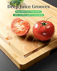 MULTIPLE SIZES: Kitsure wooden cutting board comes in many sizes. The 15"×10" board is ideal for daily use, the compact 11"×7" board works well for quick jobs like slicing fruits, and the larger 18"×12" board suits for more extensive works like carving roasts. Cutting board sets with various sizes are also available in Kitsure, enabling you to handle different ingredients at the same time.These boards also make a practical and elegant gift for housewarmings, apartment, or holiday occasions. 100% BAMBOO MATERIAL: Made from natural bamboo, the Kitsure cutting board is known for its durability, making it perfect for food preparation. Bamboo's excellent elasticity and toughness make it resistant to breaking, significantly extending the lifespan of our cutting board. What's more, its BPA-free and non-toxic properties make it safe in the kitchen. CONSIDERATE DESIGN: Thoughtfully designed for convenience, this chopping board features deep juice groove. It effectively catches excess liquids from fruits and vegetables, preventing spills and keeping your countertops clean. Additionally, the hanging hole allows for neat storage on a hook, freeing up valuable counter space. KNIFE-FRIENDLY: This bamboo wood cutting board for kitchen features a pre-oiled and polished surface that is exceptionally gentle on knives, helping to keep blades sharp for longer and making food preparation effortless. It also prevent the board from scratching and cracking, keeping the surface smooth. Enjoy a easy chopping experience with this premium board! Tips for maintenance:Keep it smooth and strong - treat your board with food-safe mineral oil. MULTIPLE USES: This charcuterie board is designed to enhance your culinary experience, allowing you to cut, prepare, and serve food easily. The built-in handle provides a comfortable grip, making it easy to carry from the countertop to the table. Besides, you can use the large cutting board as a serving platter for parties and gatherings.