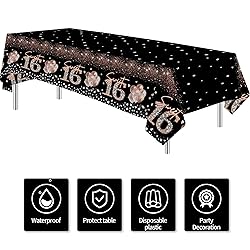 - Black and Rose Gold Sweet 16 Birthday Party Tablecloth Includes: Package: 3 Pcs Material: Disposable Size: 86 x 55 inch Our 16th birthday party decorations table cloth offer a magical experience for all ages, transforming ordinary events into extraordinary
