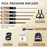 DIFFERENT COLOR ADJUSTABLE RESISTANCE BANDS: The exercise bands come with 5 different resistance level 10lbs, 20lbs, 30lbs, 40lbs and 50lbs in 5 different colors, and and can be used alone stacked in any combination to a maximum equivalent of 150 lbs MULTI FUNCTION & PORTABLE: Our resistance bands for working out can apply to different types exercise. Great for toning your arms,shoulders, chest, gluts, legs etc.Also comes with convenient travel pouch,You can take them outside, to the gym, wherever you want to work out HIGH QUALITY MATERIALS: Bands for working out is made of natural latex. Strong wear resistance and perfect elasticity, steel metal buckle for stronger strength, non-slip handle, comfortable and absorbent OUR HOME GYM: Our work out bands includes 5 exercise bands, 1 door anchor, 2 cushioned handles, carrying case and user manual to allow you to perform the widest variety of resistance training exercises possible at home SUITABLE FOR DAILY USE: Each exercise bands set is carefully constructed to resist snapping and breaking, which are able to withstand intense daily exercise sessions.Now enjoy the exercise with WHATAFIT resistance bands set