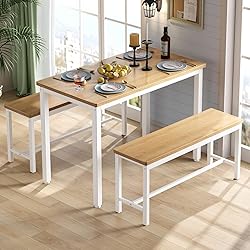 【Ideal 4-Person Dining Set】 Perfectly sized for cozy meals, this kitchen table set for 4 comfortably seats four, making it ideal for family meals and gatherings 【Space-Saving Design】 The space saving dining table is perfect for small spaces; the benches can be neatly tucked under the table when not in use, maximizing space efficiency in kitchens, apartments, or studio homes 【Durable Construction】 Crafted from durable technology wood and steel frames, this dining table with bench ensures long-lasting use; the table holds up to 200 lbs, and each bench supports up to 400 lbs, offering reliable stability for everyday use 【Industrial Chic Style】 This rustic 3 piece dining set combines a classic design with a modern industrial touch; it complements various home decor styles, adding a touch of elegance and sophistication to your space 【Quick & Simple Assembly】 Designed for convenience, the original dining table set includes all tools and clear instructions, making setup a breeze without any fuss