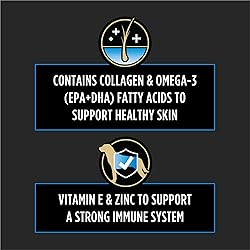 Multi-active dog skin care blend with collagen, EPA and DHA, vitamin E, and zinc to proactively support skin health and dogs with sensitive skin Dog chews containing omega-6 (linoleic acid) and omega-3 (EPA+DHA) fatty acids to help maintain the skin’s natural protective barrier for dogs with sensitive skin and those with seasonal allergies Great-tasting and easy-to-feed daily soft chew supplements for dogs containing vitamin E as an antioxidant and zinc to promote a strong immune system NASC Quality Seal: Certified by the National Animal Supplement Council (NASC) for meeting the highest quality and compliance standards for pet supplements Dog food supplements produced in USA facilities -- quality and safety you can trust