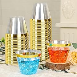 CLEAR WITH GOLDEN RIM: Crafted in a sleek tumbler shape, these PS plastic cups combine a glass-like appearance with lightweight durability. The food-grade material and reinforced design ensure secure handling - perfect for little hands to grip without spills. A shimmering gold rim elevates everyday moments into elegant experiences. MULTI-PURPOSE PARTY ESENTIAL: Perfectly sized for 9oz servings, use them for yogurt parfaits, cocktail garnishes, dessert shooters, snack cups, or creative food displays. The thickened smooth rim prevents chipping and ensures comfortable sipping. FROM PLAYDATES TO WEDDINGS: Zcaukya 9oz disposable cups are versatile and practical for use throughout your daily routine such as daily meals, cooking courses, family gatherings and more. The gold-rimmed cups also well serve for big occasions like gender reveal parties, birthday parties, engagements and weddings. FREE FROM MESS: Single-use design means no post-party scrubbing. It is clean, safe time-saving, and mess-free, so as to meet your requirement that not cleaning after a party - exactly what busy hosts need. Simply enjoy your gathering and toss responsibly. BULK VALUE WITH TEMPERATURE RESILIENCE: 100 commercial-grade cups withstand -22~176 Fahrenheit degree (-30~80 degree centigrade). Dimensions: 3.5" top × 2.2" base × 2.8" height. Stock them up for bakeries, food trucks, or large events requiring reliable disposableware.