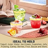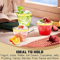 - Zcaukya Disposable Hard Plastic Cups Capacity: 9oz Quantity: 100 packs Material: PS Color: clear with gold rim Temperature Range: -22~176 Fahrenheit degree (-30~80 degree centigrade) Dimension: Top Diameter: 3.5", Bottom Diameter: 2.2", Height: 2.8" To Hold: beverage, drinking, yogurt, berries, fruits, dessert, pudding, ice cream, etc. Versatile Application: weddings, engagement, dessert making, Bridal Shower, picnic, birthday parties and other kinds of parties. Kindly Note: 1. Do not heat in a microwave oven. 2. Do not use for hot water. 3. Fragile. Do not crush.
