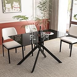 - Luxury Tempered Glass Top KUVADAZ modern dining room table is made of high-quality tempered glass which makes the table top resistant to liquids, food stains, oil, heat, scratches, and easy to clean. Heavy-duty Metal Base The rectangular dining table features a high-quality chrome metal legs, providing firm construction and reliable durability to withstand years of daily use in your home. Modern and Luxury Design The black glass, elegant appearance and black metal legs which adds a charming and beautiful look to your space, suitable for a variety of decor styles, like modern, mid century, farmhouse, rustic, retro, industrial decor and more. Rectangle Dining Table The spacious desktop can easily seat 2-6 people, perfect as dinner table, kitchen table, coffee table, living room table, meeting table and more. Let your family and friends can enjoy the good time of dinner together and feel the beauty of life. Specification Tabletop Material: Tempered Glass Pedestal Material: Chrome Metal Simple Assembly Required: Yes Package Included: 1 x Table