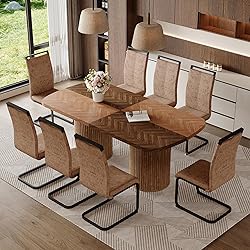 Ample Dining Space: The tabletop measures 78.7” L x 39.3” W x 30” H, it comfortably seats 8 to 10 people, its ample space invites you to savor every moment with loved ones, making it perfect for dinner parties or family gatherings. Beyond dining, it transforms effortlessly into a workbench, office desk, or conference table Sturdy Construction & Hidden Storage: The high-grade MDF construction ensures durability, while the double pedestal base provides unwavering stability. The interior of the table legs is a hollow structure supported by sturdy iron frames, forming a hidden and practical additional storage space. It can be used to place placemats, tableware, and other items to keep clean and orderly Comfortable Seating: The set includes 8 dining chairs. Comfort is a priority with thick, high-density sponge cushions and an ergonomically contoured backrest, making them ideal for long hours of dining, working, or relaxing. The footpads add to the stability while protecting your floors from scratches Timeless & Elegant: The kitchen table features a rectangular shaped tabletop and delicate bottom line. The sleek design and warm retro brown finish elevate your dining experience. The scratch-resistant and waterproof laminate finish keeps it looking its best. Not only are these chairs practical and versatile, they also have an overall vintage appeal that makes them perfect for both formal and casual dining spaces Easy Installation: Assembly is a breeze with the included installation guide and tools, offering hassle-free setup for your next gathering. We are always available to provide professional customer service before and after your purchase, so purchase with confidence