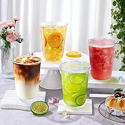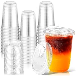 50 Pack Cups with Lids: You will receive 50 pcs disposable clear plastic cups with lids, the maximum capacity of each cup is about 16 oz, the size is 4.52(L)×3.46(W) inches, enough quantity can meet your use and replacement needs that is a good helper for daily party or business events Premium Material: The plastic cups with lids is made of PET material, whihch is high transparency, good gloss, good toughness, not easy to deform and not easy to break, no odor, NO BPA, recyclable, lightweight and long-lasting. These cups are suitable for various beverages, is a good choice for outdoor places to carry drinks Strawless Design: These iced coffee cups have a cozy sipping hole in the lid, so you can enjoy your drink without using a straw. And the sip hole is large enough to allow you to eat the pearls inside even when drinking pearl milk tea. The tight fit of the cup and lid also prevents spills and splashes (except at the sip hole) U-shape Cups: The coffee cups with lids adopts U-shape design, the cup body is rounded and smooth, comfortable to hold in your hand and with aesthetic characteristics, which can provide you with a hint of fun and small surprises. The bottom of the cup is made of thickened material, which is not easy to pour when placed on a flat surface, perfect for daily life and traveling Wide Application: Our 16 oz disposable cups with sip lids are easy to use and perfect for serving iced coffee, iced coke, car drinks, sparkling water, lemonade, milk tea, milkshake, smoothie and other cold drinks. They are a must-have for coffee shops, tea stores, fast food restaurants, office tearooms, etc. They are also perfect for picnics and camping, wedding parties, birthday parties, family and friends gatherings, etc