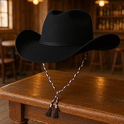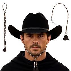 (HAT NOT INCLUDED) Braided Chin Strap for Cowboy Hat: Keep your hat secure with classic western flair! Hand-braided in rich brown and white tones using natural hemp fibers, with polished metal hooks and decorative tassel ends for a bold cowboy look. Our braided cowboy hat chin strap is the perfect accessory for those who live and breathe the cowboy lifestyle. Authentic Western Craftsmanship: Hand-braided in rich brown and white tones, featuring polished metal hooks and decorative tassel ends for a bold cowboy look. Secure & Adjustable Fit: Includes a smooth-sliding metal bead for a customizable fit that keeps your hat in place even on windy days. Built to Last: Durable synthetic fibers withstand daily wear — perfect for rodeos, ranch work, festivals, or any outdoor adventure. Easy To Use: Putting on and taking off the chin strap is quick and easy. Change hats or adjust it to your needs with ease. Forget worrying about your hat blowing away on windy days. Our chin strap will keep it firmly in place.